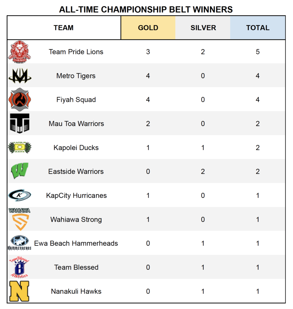 | 14u | Wahiawa Strong | Mau Toa Warriors | KapCity Hurricanes | Metro Tigers | Metro Tigers |